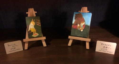 ミニキャンバスに描いたアクリル画作品、「赤いくつをかいに」と「背中あわせの夜語り」を展示しました。